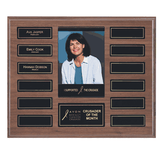 This fabulous employee plaque measures 10 1/2 x 13 and features a recognition photo holder. The 4" 6" photo slot is folded over on top & bottom so photos slide into place from either side. This unique employee plaque combines easy release individual plates with a beautiful hand rubbed American Walnut veneer plaque. The exclusive Magnetic Release feature for plates and photo holder allows for easy push and pull replacement. Includes (12) 1 x 3 inch small name plates and a 2 x 4" main plate. The price of the item includes personalized engraving on the main plate along with 1 small name plate. Additional name plates can be engraved for an additional charge. Outstanding for employee of the month programs and workplace recognition. Ships from: Marquette, Michigan. SKU: apt205dbkjds-tc.