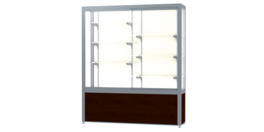Waddell's Challenger Series are built with heavy-duty construction to withstand the rigors of a busy hallway, a crowded entrance way, or an industrial break room. With anodized durable aluminum extrusions, steel shelving hardware, 1/4" plate glass shelves and sliding tempered glass doors, the Challenger Series can endure real world conditions. Built-in locks are included to add protection to your possessions displayed inside. Choose from three different designs and several style options including wood grained vinyl, aluminum or black laminate to create a robust, yet sophisticated look for the environment of your choosing. The aluminum frame can be finished in Dark Bronze or Satin Natural to complement your decor and displays inside. Challenger is available in widths from 48" to a wide 144". All cases ship to you in Waddell's exceptional packaging and come fully assembled. Challenger is backed by Waddell's Limited Lifetime Warranty and made in the USA. SKU: 10405pb-sn-w-WD.