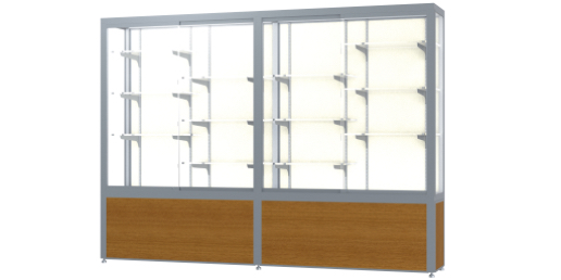 Waddell's Challenger Series are built with heavy-duty construction to withstand the rigors of a busy hallway, a crowded entrance way, or an industrial break room. With anodized durable aluminum extrusions, steel shelving hardware, 1/4" plate glass shelves and sliding tempered glass doors, the Challenger Series can endure real world conditions. Built-in locks are included to add protection to your possessions displayed inside. Choose from three different designs and several style options including wood grained vinyl, aluminum or black laminate to create a robust, yet sophisticated look for the environment of your choosing. The aluminum frame can be finished in Dark Bronze or Satin Natural to complement your decor and displays inside. Challenger is available in widths from 48" to a wide 144". All cases ship to you in Waddell's exceptional packaging and come fully assembled. Challenger is backed by Waddell's Limited Lifetime Warranty and made in the USA. SKU: 10408pb-sn-k-WD.