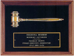 This fabulous gavel plaque measures 13"W x 10"H and features a black Walnut frame and black felt shadowbox. A gold electroplated gavel is mounted on the plaque. Gavel plaque includes up to 5 lines of personalized engraving. This is a great recognition plaque for an outstanding committee member, leader or president. Ships from: Marquette, Michigan. SKU: pg2440ar-tc.