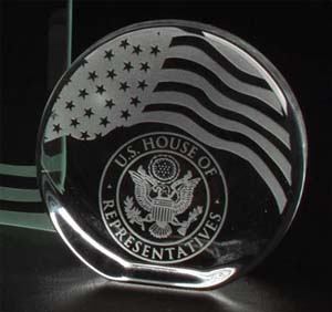 Optical Crystal with stunning embedded flag. Size: 3.5 inches Diameter. Etch Area: 1.25 inches H x 2 inches W. Price includes personalization! SKU: 1912p-gla.