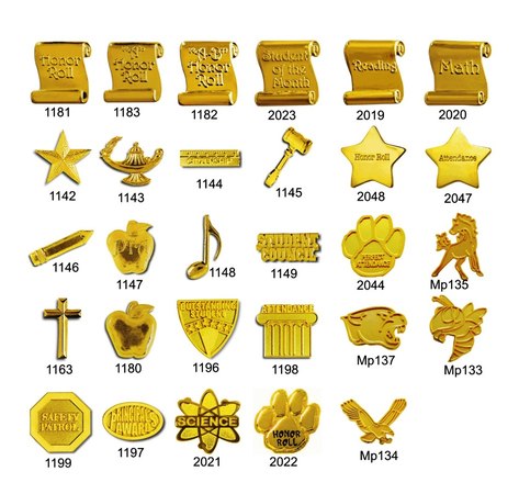 Please Choose 1st Pin Type: None Selected Yet Star, 1142 Lamp, 1143 Citizenship, 1144 Gavel, 1145 Pencil, 1146 PTA Apple, 1147 Music Note, 1148 Student Council, 1149 Cross, 1163 Apple, 1180 Honor Roll, 1181 AB Honor Roll, 1182 A Honor Roll, 1183 Outstanding Student, 1196 Principals Award, 1197 Attendance, 1198 Safety Patrol, 1199 Reading, 2019 Math, 2020 Science, 2021 Honor Roll Paw, 2022 Student of the Month, 2023 Perfect Attendance Paw, 2044 Attnedance Star, 2047 Honor Roll Star, 2048 Bee, MP133 Hawk, MP134 Mustang, MP135 Cougar, MP137