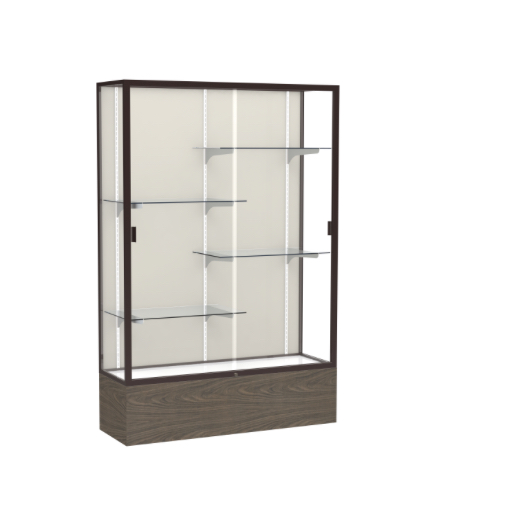 Waddell's Reliant Series combines the strength and durability of aluminum with either woodgrain vinyl or oak veneer to frame your accolades. These six-foot display cases are available in three select widths or with an option of a smaller three-foot high case, as well. Anodized aluminum framing that is available in Champagne, Dark Bronze or Natural Satin secures the sliding glass doors and incorporates a built-in lock for a protected display of your treasured memorabilia. Illuminate and customize your display with a lighted cornice and 4 half-length adjustable shelves. With Reliant, you have the opportunity to make a display that is something truly your own. The accent wood completes the design for a clean and uncluttered appearance making Reliant display cases accommodating to either a traditional or contemporary setting. All cases ship to you in Waddell's exceptional packaging and come fully assembled. Reliant is backed by Waddell's Limited Lifetime Warranty and made in the USA. SKU: 2074pb-bz-lv-WD.