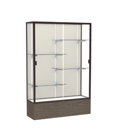 Waddell's Reliant Series combines the strength and durability of aluminum with either woodgrain vinyl or oak veneer to frame your accolades. These six-foot display cases are available in three select widths or with an option of a smaller three-foot high case, as well. Anodized aluminum framing that is available in Champagne, Dark Bronze or Natural Satin secures the sliding glass doors and incorporates a built-in lock for a protected display of your treasured memorabilia. Illuminate and customize your display with a lighted cornice and 4 half-length adjustable shelves. With Reliant, you have the opportunity to make a display that is something truly your own. The accent wood completes the design for a clean and uncluttered appearance making Reliant display cases accommodating to either a traditional or contemporary setting. All cases ship to you in Waddell's exceptional packaging and come fully assembled. Reliant is backed by Waddell's Limited Lifetime Warranty and made in the USA. SKU: 2074pb-bz-wv-WD.
