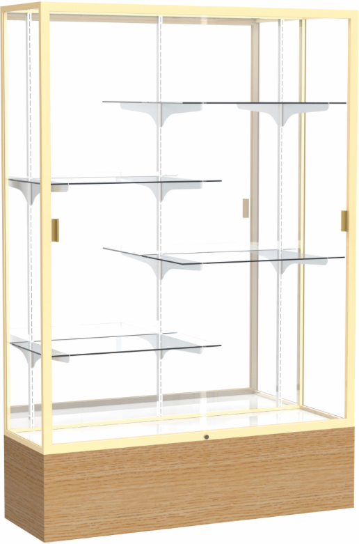 Waddell's Reliant Series combines the strength and durability of aluminum with either woodgrain vinyl or oak veneer to frame your accolades. These six-foot display cases are available in three select widths or with an option of a smaller three-foot high case, as well. Anodized aluminum framing that is available in Champagne, Dark Bronze or Natural Satin secures the sliding glass doors and incorporates a built-in lock for a protected display of your treasured memorabilia. Illuminate and customize your display with a lighted cornice and 4 half-length adjustable shelves. With Reliant, you have the opportunity to make a display that is something truly your own. The accent wood completes the design for a clean and uncluttered appearance making Reliant display cases accommodating to either a traditional or contemporary setting. All cases ship to you in Waddell's exceptional packaging and come fully assembled. Reliant is backed by Waddell's Limited Lifetime Warranty and made in the USA. SKU: 2074pb-gd-ak-WD.