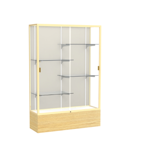Waddell's Reliant Series combines the strength and durability of aluminum with either woodgrain vinyl or oak veneer to frame your accolades. These six-foot display cases are available in three select widths or with an option of a smaller three-foot high case, as well. Anodized aluminum framing that is available in Champagne, Dark Bronze or Natural Satin secures the sliding glass doors and incorporates a built-in lock for a protected display of your treasured memorabilia. Illuminate and customize your display with a lighted cornice and 4 half-length adjustable shelves. With Reliant, you have the opportunity to make a display that is something truly your own. The accent wood completes the design for a clean and uncluttered appearance making Reliant display cases accommodating to either a traditional or contemporary setting. All cases ship to you in Waddell's exceptional packaging and come fully assembled. Reliant is backed by Waddell's Limited Lifetime Warranty and made in the USA. SKU: 2074pb-gd-lv-WD.