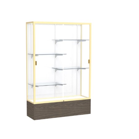 Waddell's Reliant Series combines the strength and durability of aluminum with either woodgrain vinyl or oak veneer to frame your accolades. These six-foot display cases are available in three select widths or with an option of a smaller three-foot high case, as well. Anodized aluminum framing that is available in Champagne, Dark Bronze or Natural Satin secures the sliding glass doors and incorporates a built-in lock for a protected display of your treasured memorabilia. Illuminate and customize your display with a lighted cornice and 4 half-length adjustable shelves. With Reliant, you have the opportunity to make a display that is something truly your own. The accent wood completes the design for a clean and uncluttered appearance making Reliant display cases accommodating to either a traditional or contemporary setting. All cases ship to you in Waddell's exceptional packaging and come fully assembled. Reliant is backed by Waddell's Limited Lifetime Warranty and made in the USA. SKU: 2074wb-gd-wv-WD.