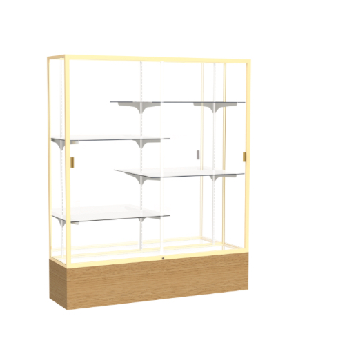 Waddell's Reliant Series combines the strength and durability of aluminum with either woodgrain vinyl or oak veneer to frame your accolades. These six-foot display cases are available in three select widths or with an option of a smaller three-foot high case, as well. Anodized aluminum framing that is available in Champagne, Dark Bronze or Natural Satin secures the sliding glass doors and incorporates a built-in lock for a protected display of your treasured memorabilia. Illuminate and customize your display with a lighted cornice and 4 half-length adjustable shelves. With Reliant, you have the opportunity to make a display that is something truly your own. The accent wood completes the design for a clean and uncluttered appearance making Reliant display cases accommodating to either a traditional or contemporary setting. All cases ship to you in Waddell's exceptional packaging and come fully assembled. Reliant is backed by Waddell's Limited Lifetime Warranty and made in the USA. SKU: 2075mb-gd-ak-WD.