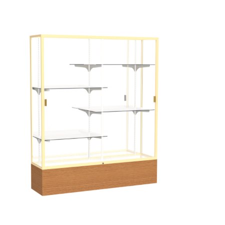 Waddell's Reliant Series combines the strength and durability of aluminum with either woodgrain vinyl or oak veneer to frame your accolades. These six-foot display cases are available in three select widths or with an option of a smaller three-foot high case, as well. Anodized aluminum framing that is available in Champagne, Dark Bronze or Natural Satin secures the sliding glass doors and incorporates a built-in lock for a protected display of your treasured memorabilia. Illuminate and customize your display with a lighted cornice and 4 half-length adjustable shelves. With Reliant, you have the opportunity to make a display that is something truly your own. The accent wood completes the design for a clean and uncluttered appearance making Reliant display cases accommodating to either a traditional or contemporary setting. All cases ship to you in Waddell's exceptional packaging and come fully assembled. Reliant is backed by Waddell's Limited Lifetime Warranty and made in the USA. SKU: 2075mb-gd-mk-WD.