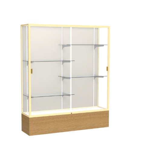 Waddell's Reliant Series combines the strength and durability of aluminum with either woodgrain vinyl or oak veneer to frame your accolades. These six-foot display cases are available in three select widths or with an option of a smaller three-foot high case, as well. Anodized aluminum framing that is available in Champagne, Dark Bronze or Natural Satin secures the sliding glass doors and incorporates a built-in lock for a protected display of your treasured memorabilia. Illuminate and customize your display with a lighted cornice and 4 half-length adjustable shelves. With Reliant, you have the opportunity to make a display that is something truly your own. The accent wood completes the design for a clean and uncluttered appearance making Reliant display cases accommodating to either a traditional or contemporary setting. All cases ship to you in Waddell's exceptional packaging and come fully assembled. Reliant is backed by Waddell's Limited Lifetime Warranty and made in the USA. SKU: 2075pb-gd-ak-WD.