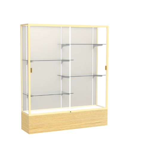 Waddell's Reliant Series combines the strength and durability of aluminum with either woodgrain vinyl or oak veneer to frame your accolades. These six-foot display cases are available in three select widths or with an option of a smaller three-foot high case, as well. Anodized aluminum framing that is available in Champagne, Dark Bronze or Natural Satin secures the sliding glass doors and incorporates a built-in lock for a protected display of your treasured memorabilia. Illuminate and customize your display with a lighted cornice and 4 half-length adjustable shelves. With Reliant, you have the opportunity to make a display that is something truly your own. The accent wood completes the design for a clean and uncluttered appearance making Reliant display cases accommodating to either a traditional or contemporary setting. All cases ship to you in Waddell's exceptional packaging and come fully assembled. Reliant is backed by Waddell's Limited Lifetime Warranty and made in the USA. SKU: 2075pb-gd-lv-WD.
