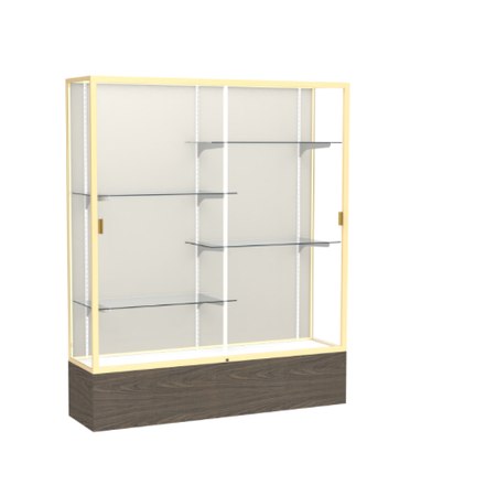 Waddell's Reliant Series combines the strength and durability of aluminum with either woodgrain vinyl or oak veneer to frame your accolades. These six-foot display cases are available in three select widths or with an option of a smaller three-foot high case, as well. Anodized aluminum framing that is available in Champagne, Dark Bronze or Natural Satin secures the sliding glass doors and incorporates a built-in lock for a protected display of your treasured memorabilia. Illuminate and customize your display with a lighted cornice and 4 half-length adjustable shelves. With Reliant, you have the opportunity to make a display that is something truly your own. The accent wood completes the design for a clean and uncluttered appearance making Reliant display cases accommodating to either a traditional or contemporary setting. All cases ship to you in Waddell's exceptional packaging and come fully assembled. Reliant is backed by Waddell's Limited Lifetime Warranty and made in the USA. SKU: 2075pb-gd-wv-WD.