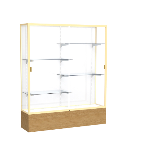 Waddell's Reliant Series combines the strength and durability of aluminum with either woodgrain vinyl or oak veneer to frame your accolades. These six-foot display cases are available in three select widths or with an option of a smaller three-foot high case, as well. Anodized aluminum framing that is available in Champagne, Dark Bronze or Natural Satin secures the sliding glass doors and incorporates a built-in lock for a protected display of your treasured memorabilia. Illuminate and customize your display with a lighted cornice and 4 half-length adjustable shelves. With Reliant, you have the opportunity to make a display that is something truly your own. The accent wood completes the design for a clean and uncluttered appearance making Reliant display cases accommodating to either a traditional or contemporary setting. All cases ship to you in Waddell's exceptional packaging and come fully assembled. Reliant is backed by Waddell's Limited Lifetime Warranty and made in the USA. SKU: 2075wb-gd-ak-WD.