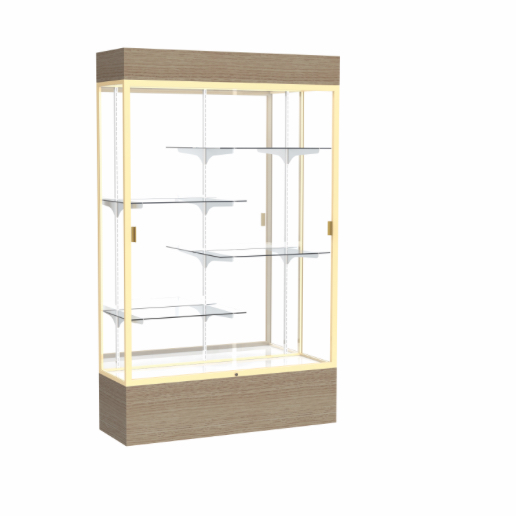 WADDELL's Reliant Lighted Series enhances your presentation, while it combines the strength and durability of aluminum with the engaging look of wood. Anodized aluminum framing secures the sliding tempered glass doors and built-in lock. The accent wood, oak veneer or wood-grained vinyl, completes the design for a clean, uncluttered appearance. Ideal for either traditional or contemporary settings, the Reliant is a value-packed choice for the protected display of your treasured memorabilia. Backed by WADDELL's Limited Lifetime Warranty. Made in the USA. SKU: 2174mb-gd-dk-WD.