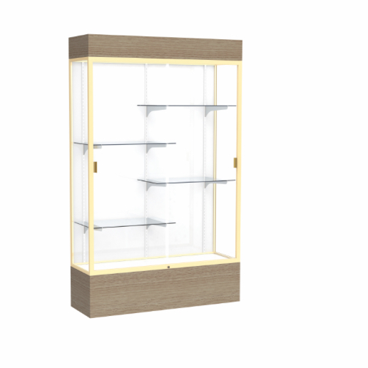 Reliant Lighted Driftwood Oak case, White Laminate Back w/ Champagne aluminum frame finish, 80"H x 48"W x 16"D (Item #: 2174wb-gd-dk-WD)