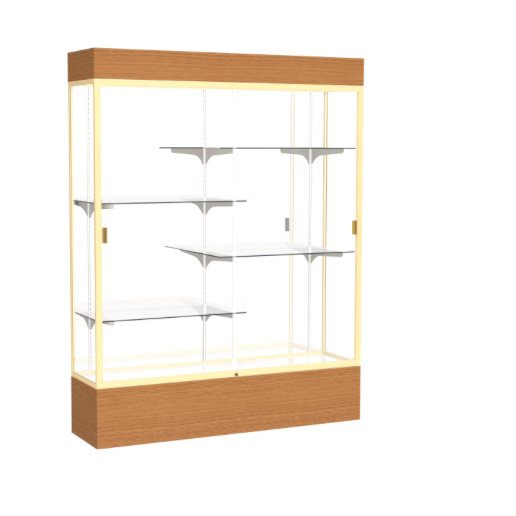 Waddell's Reliant Series combines the strength and durability of aluminum with either woodgrain vinyl or oak veneer to frame your accolades. These six-foot display cases are available in three select widths or with an option of a smaller three-foot high case, as well. Anodized aluminum framing that is available in Champagne, Dark Bronze or Natural Satin secures the sliding glass doors and incorporates a built-in lock for a protected display of your treasured memorabilia. Illuminate and customize your display with a lighted cornice and 4 half-length adjustable shelves. With Reliant, you have the opportunity to make a display that is something truly your own. The accent wood completes the design for a clean and uncluttered appearance making Reliant display cases accommodating to either a traditional or contemporary setting. All cases ship to you in Waddell's exceptional packaging and come fully assembled. Reliant is backed by Waddell's Limited Lifetime Warranty and made in the USA. SKU: 2175mb-gd-mk-WD.