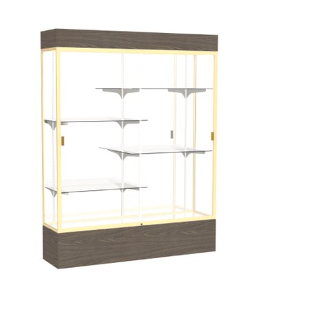 Waddell's Reliant Series combines the strength and durability of aluminum with either woodgrain vinyl or oak veneer to frame your accolades. These six-foot display cases are available in three select widths or with an option of a smaller three-foot high case, as well. Anodized aluminum framing that is available in Champagne, Dark Bronze or Natural Satin secures the sliding glass doors and incorporates a built-in lock for a protected display of your treasured memorabilia. Illuminate and customize your display with a lighted cornice and 4 half-length adjustable shelves. With Reliant, you have the opportunity to make a display that is something truly your own. The accent wood completes the design for a clean and uncluttered appearance making Reliant display cases accommodating to either a traditional or contemporary setting. All cases ship to you in Waddell's exceptional packaging and come fully assembled. Reliant is backed by Waddell's Limited Lifetime Warranty and made in the USA. SKU: 2175mb-gd-wv-WD.