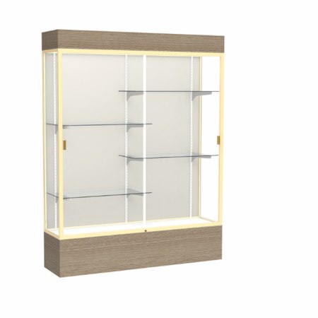 Reliant Lighted Driftwood Oak case, Plaque Fabric Back w/ Champagne aluminum frame finish, 80"H x 60"W x 16"D (Item #: 2175pb-gd-dk-WD)
