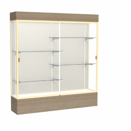 Reliant Lighted Driftwood Oak case, Plaque Fabric Back w/ Champagne aluminum frame finish, 80"H x 72"W x 16"D (Item #: 2176pb-gd-dk-WD)