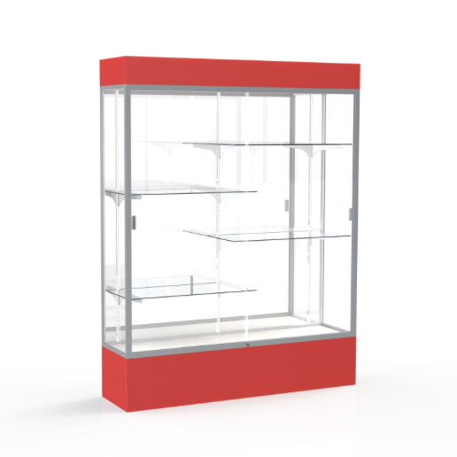 Waddell's Spirit Series is the perfect solution to show off your school pride or add a pop of color to your office. The lighted cornice will accentuate your most memorable achievements. With over 360 combinations to suit your expression of your organization, Spirit's features include a 12" high base in 10 vibrant color options, three backing choices, three sizes, and anodized aluminum frames in three different finishes. Spirit includes 4 half-length shelves to customize your arrangement to make it your own. Sliding tempered glass doors include built-in locks for added security of your achievements. All cases ship to you in Waddell's exceptional packaging and come fully assembled. Spirit is backed by Waddell's Limited Lifetime Warranty and Made in the USA. SKU: 3175mb-sn-rd-WD.