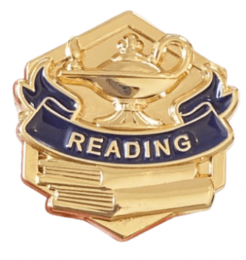 Our unique 3D Series gold enamel lapel pins feature raised lettering (Reading) on a dark blue background. The books and academic excellence lamp are also raised, giving the pins a three-dimensional effect. Select an optional display box below. Each pin features a clutch-back and measures approximately 7/8". Minimum quantity: 5. Perfect for academic recognition ceremonies and scholarly achievement. Ships from: Marquette, Michigan. SKU: 3d10-tc.