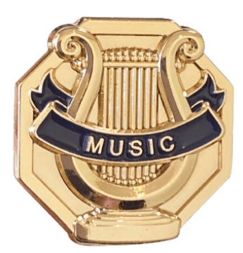 Our unique 3D Series gold enamel lapel pins feature raised lettering (Music) on a dark blue background. The lyre is also raised, giving the pins a three-dimensional effect. Select an optional display box below. Each pin features a clutch-back and measures approximately 7/8". Minimum quantity: 5. Ships from: Marquette, Michigan. SKU: 3d11-tc.