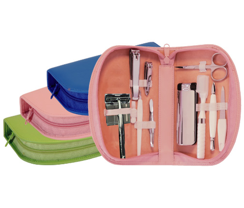 Deluxe ladies travel/grooming kit features a battery operated shaver and 9 grooming essentials in stunning white and chrome. Essentials include nail and toe nail clippers, Scissors, mail file, two-way cuticle pusher, trimmer, toothbrush and brush/shoe horn combo. Measures 7 5/8 x 2 7/8 x 1 1/2. SKU: 560-6-RYL.