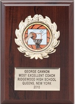5 X 7 inch walnut finish plaque comes with gold aluminum plate, plastic wreath and takes 2 inch medallion insert. Price of plaque varies based on type of insert chosen (Mylar, Litho or Etched). Includes 4 lines of personalized engraving and up to 20 characters/spaces per line. Wonderful for rewarding accomplishments and milestones. Ships from: Mount Vernon, New York. SKU: 5x7plaque.