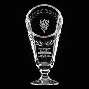 The laurel wreath, a symbol of triumph since the ancient Greeks, receives a new interpretation. The cut glass wreath that encircles the ellipse is contemporary yet timeless. This expression of greatness is mouth-blown and hand-cut by highly skilled European artisans and is a prized possession for sure. Available in 2 sizes. Small measures 11.5 inches H x 5.25 inches W. Etch area: Logo: 2 inches H x 2.5 inches W Base: 2 inches H x 2.25 inches W. Large measures 13.5 inches H x 6.25 inches W. Etch area: Logo: 2.75 inches H x 2.5 inches W Base: 2.25 inches H x 2.5 inches W. SKU: 601x-jc.
