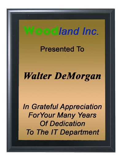 8" x 10" Black Matte Finish Wall Plaque with Gold or White Plate and Black Text. Optional Sublimated Logo is in Full Color. Includes up to 18 lines of personalized engraving & up to 30 characters (including spaces) per line. Ships from: Marquette, Michigan. SKU: 8x10blackfinish-qt.