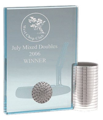 Turnbury Optical Crystal Golf Award. Available in 2 sizes. Small Size: 7 inches h x 5 inches W Etch Area: 3.75 inches H x 2.75 inches W. Large Size: 8 inches H x 6 inches W Etch Area: 4.75 inches H x 3.75 inches W. Great for golf season events and tournament recognition. SKU: 953x-gla.