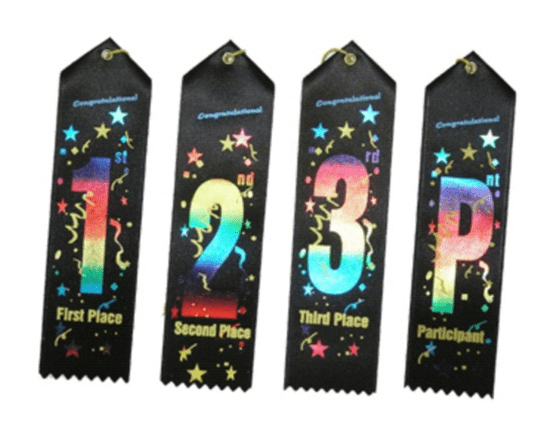 Celebration style ribbons are available in 1st through 3rd Place & Participant (sorry, color of ribbon / print color is standard and can't be changed). Each ribbon features a card & string. Sold in packages of 25. Celebration Ribbons ship from Indiana in just 1-2 business days and qualify for free shipping on orders over $100. Please press the Select Options Tab to begin the ordering process. SKU: 9BSx-TW.