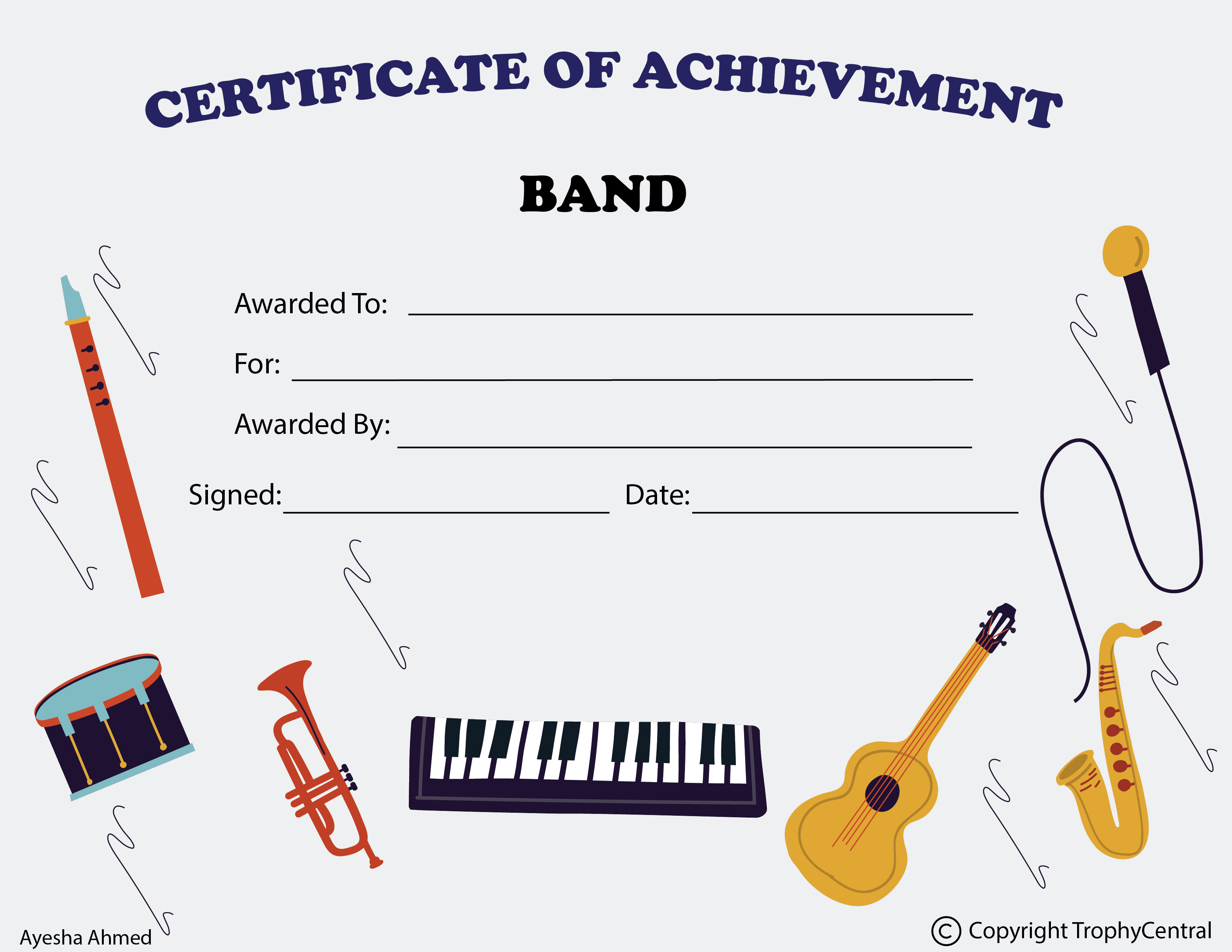 This is a band achievement template designed exclusively for TrophyCentral. It is a perfect way for you to recognize talented students! Our free certificates were designed to be printable and use less ink to save you money. Simply press the View Now Button and then right click on the image and select Save File to download it. Band achievement templates measure 8 1/2" x 11". Outstanding for honoring music achievement and success. SKU: achievement-band-521-tc.