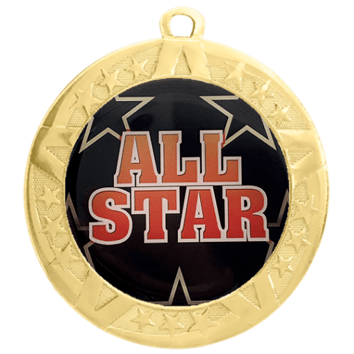 These all star insert medals feature a 2 3/4 inch gold frame with a colorful 2 inch Epoxy dome subject sticker. Each medal also includes a red, white and blue neck ribbon. Optional personalization on back. Wonderful for recognizing accomplishments and milestones. Ships from: Marquette, Michigan. SKU: all-star-jigf-tc.