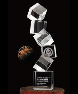 Named for the artful ballet posture, the Arabesque is an interesting play on cubes that appear to defy gravity as they ascend through space. Made of pure optical crystal, this contemporary sculpture shatters its surroundings and then reassembles it into an abstract design of cubist fashion. Tall, heavy, and eye-catching, this Theme-Award makes a statement about brilliant individuals whose vision and fire make the impossible possible. A romance card elaborating this theme is included for your presentation. Another J.Charles Theme-Award original. Deep etch. Measures 10"H x 4"W. Outstanding for celebrating art skills and dedication. SKU: 600x-jc.