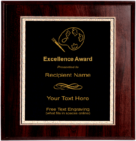This art award plaque features a stock artist's palette image, your text personalized engraving and a beautiful Cherry wood finish. Use our personalization wizard and select 'Use popular template' or create your own unique design! Art plaques are available in three popular sizes, 9"x7", 10"x8" and 12"x9". Please select below. Stock artwork and text personalized engraving is free! Shown with a black personalized engraving plate with gilded edge. Ships from: Marquette, Michigan. SKU: art-plaque-tc.