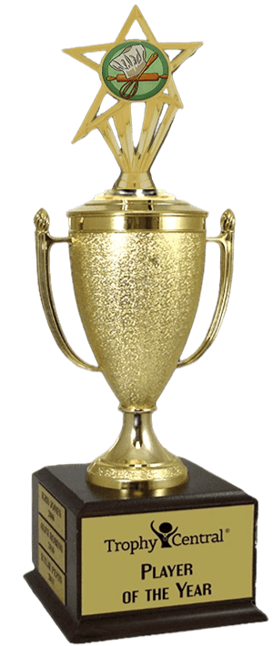 This popular Baking Insert Champion's Cup trophy features a Cherry finish wood base (5 1/2" x 4") and an 8 3/4" gold-tone plastic cup. It also includes up to 4 lines of personalized engraving for free, including name personalization! 1" x 3" Side Plates can be added for an additional price if used as a perpetual trophy. Measures about 13" tall! Ships from: Marquette, Michigan. SKU: champions-baking-i-tc.