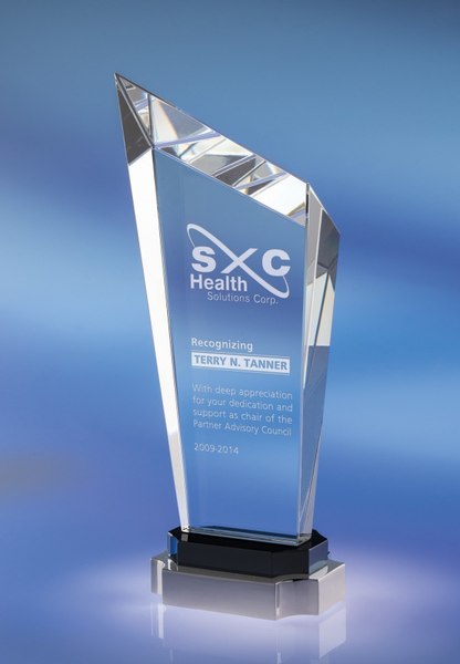 Tradition meets modern with our Steadfast Award. This ultramodern shape finds an unlikely counterpart on its traditionally styled base. It's all united, though, through the use of modern materials such as clear optic, black optic and polished chrome. Small measures: 9"H x 3.5"W x 2.25"D Large measures: 10.5"H x 3.5"W x 2.25"D SKU: 143x-jc.