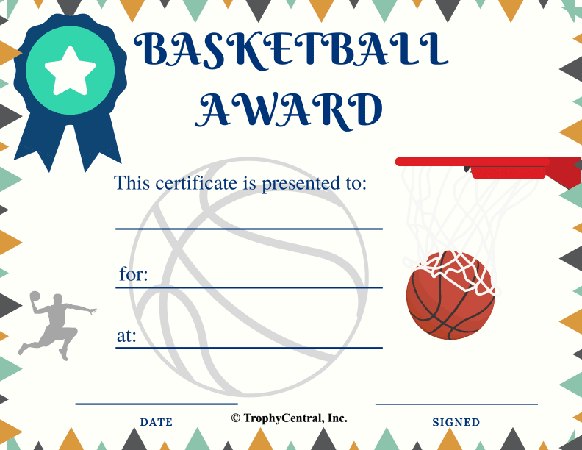 This is a free Basketball certificate template! Our free certificates were designed to be printable and use less ink to save you money. Simply press the View Now Button and then right click on the image and select Save File to download it. Award certificates measure 8 1/2" x 11". Be sure to see all of our Free Certificates and our great selection of Basketball Trophies and Awards. Ideal for basketball season competitions and playoff celebrations. SKU: basketball-free-tc.
