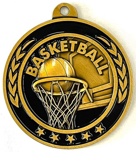 These antique gold Basketball medals were designed exclusively for Trophy Central! Each medal features a black-color-fill for a unique look. Medals also include a red, white and blue neck ribbon. Medal measures 2 1/4". Optional personalization on back. Ideal for basketball season competitions and playoff celebrations. Ships from: Marquette, Michigan. SKU: basketball-mg-tc.