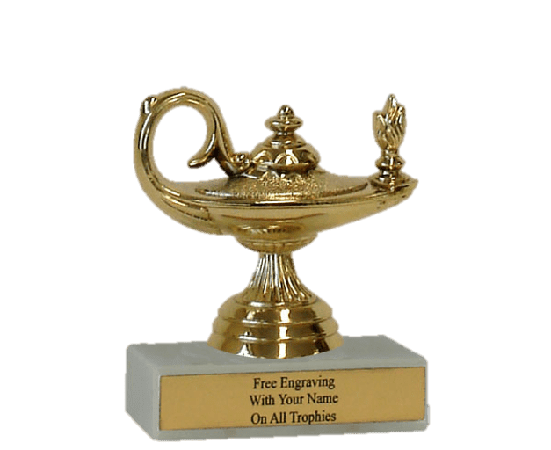 There is nothing cheap about this budget-minded trophy. It's perfect as a general school / academic achievement trophy or as a kid's participation trophy. Features a gold-tone plastic lamp of learning figure, a real white marble base and a gold engraved plate with black text. Also includes up to three lines of engraving for free, including name personalization! Qualifies for Ships from Marquette, MI. in 1-2 business days. Measures about 4 - 4 1/2" tall. SKU: QSBUDACAD-TC.