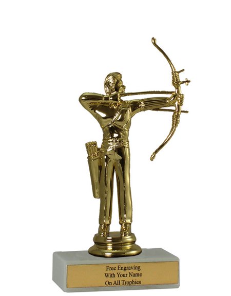 There is nothing cheap about this budget-minded trophy. It's perfect as a general archery achievement trophy or as a kid's participation trophy. Features a gold-tone plastic archer figure, a real white marble base and a gold engraved plate with black text. Also includes up to three lines of engraving for free, including name personalization! Qualifies for Ships from Marquette, MI. in 1-2 business days. Measures about 4 - 4 1/2" tall. SKU: QSBUDARCH-QTT.