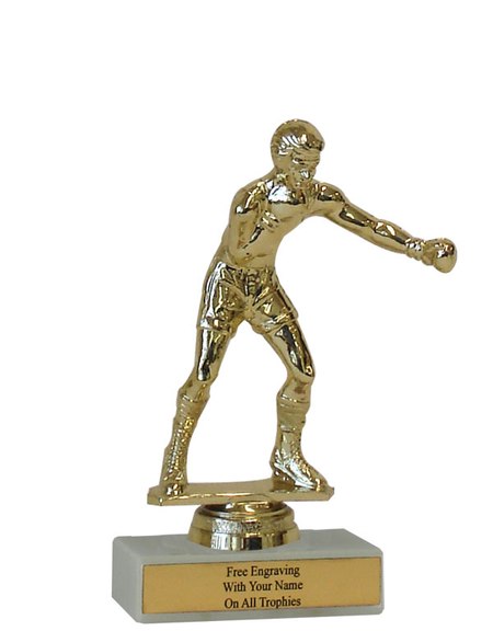 There is nothing cheap about this budget-minded trophy. It's perfect as a general boxing achievement trophy or participation trophy. Features a gold-tone plastic boxer figure, a real white marble base and a gold engraved plate with black text. Also includes up to three lines of personalized engraving for free, including name personalization! Measures about 4 - 4 1/2" tall. Ships from: Marquette, Michigan. SKU: qsbudbox-tc.