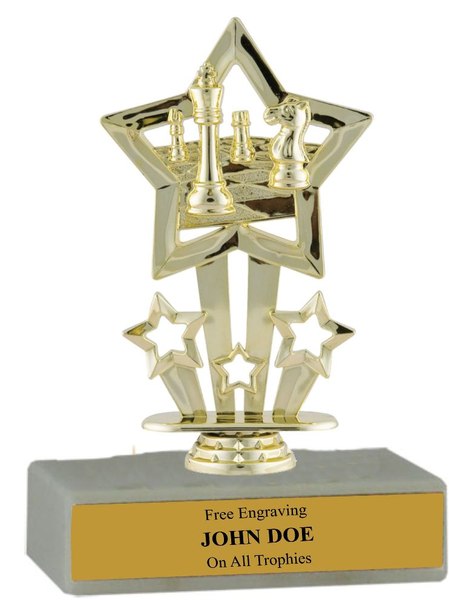 There is nothing cheap about this budget-minded trophy. Features a gold-tone plastic chess figure, a real white marble base and a gold engraved plate with black text. Also includes up to three lines of personalized engraving for free, including name personalization! Measures about 4 - 4 1/2" tall. Outstanding for acknowledging chess excellence and achievement. Ships from: Marquette, Michigan. SKU: budget-series-chess-p.