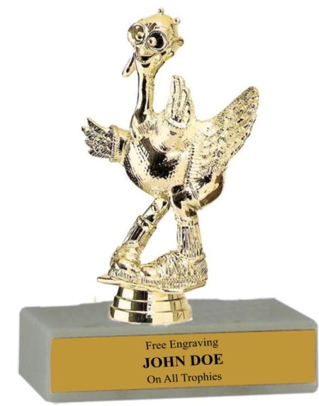 There is nothing cheap about this budget-minded trophy. It's perfect as a loser or last place trophy. Features a gold-tone plastic comic turkey figure, a real white marble base and a gold engraved plate with black text. Also includes up to three lines of personalized engraving for free, including name personalization! Measures about 4 - 4 1/2" tall. Ships from: Marquette, Michigan. SKU: budget-series-comic-turkey-tc.
