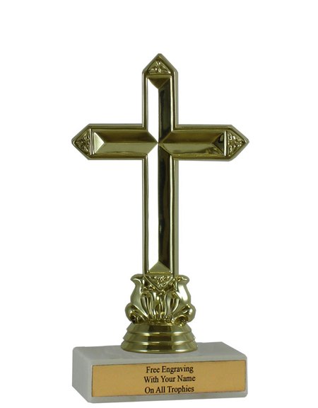 There is nothing cheap about this budget-minded trophy. It's perfect as a general religious achievement trophy or as a kid's participation trophy. Features a gold-tone plastic cross figure, a real white marble base and a gold engraved plate with black text. Also includes up to three lines of engraving for free, including name personalization! Qualifies for Ships from Marquette, MI. in 1-2 business days. Measures about 4 - 4 1/2" tall. SKU: QSBUDCROSS-TC.