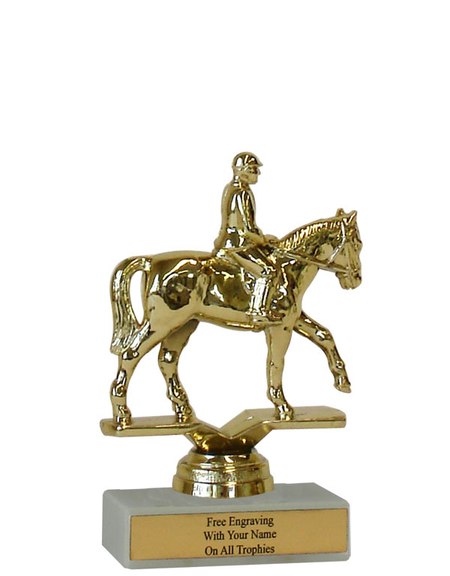 There is nothing cheap about this budget-minded trophy. It's perfect as a general achievement trophy or as a participation trophy. Features a gold-tone plastic horse & rider figure, a real white marble base and a gold engraved plate with black text. Also includes up to three lines of engraving for free, including name personalization! Qualifies for Ships from Marquette, MI. in 1-2 business days. Measures about 4 - 4 1/2" tall. SKU: QSBUDEQUES-TC.