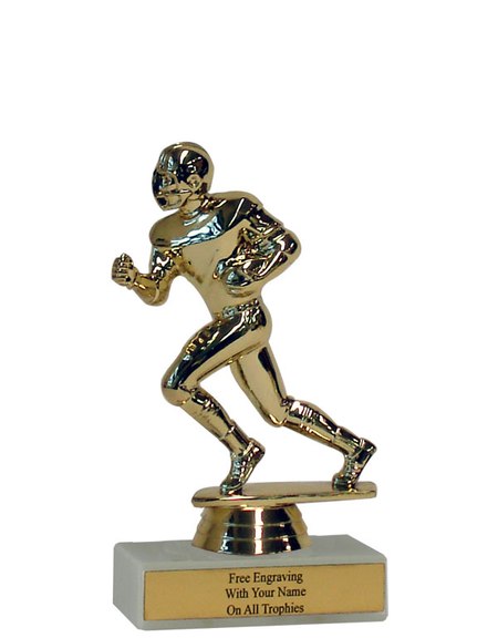 There is nothing cheap about this budget-minded trophy. It's perfect as a general football achievement trophy or as a kid's participation trophy. Features a gold-tone plastic football figure (running back), a real white marble base and a gold engraved plate with black text. Also includes up to three lines of engraving for free, including name personalization! Qualifies for Ships from Marquette, MI. in 1-2 business days. Measures about 4 - 4 1/2" tall. SKU: QSBUDFOOT-TC.