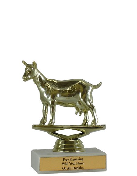 There is nothing cheap about this budget-minded trophy. It's perfect as a general achievement trophy or as a participation trophy. Features a gold-tone plastic goat figure, a real white marble base and a gold engraved plate with black text. Also includes up to three lines of engraving for free, including name personalization! Qualifies for Ships from Marquette, MI. in 1-2 business days. Measures about 4 - 4 1/2" tall. SKU: QSBUDGOAT-QTT.
