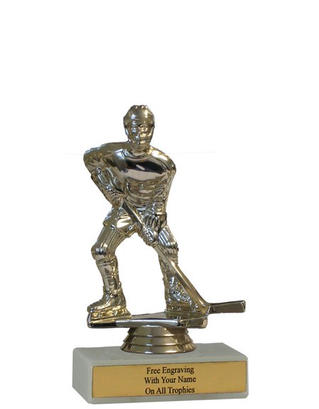 There is nothing cheap about this budget-minded trophy. It's perfect as a general hockey achievement trophy or as a kid's participation trophy. Features a gold-tone plastic hockey figure, a real white marble base and a gold engraved plate with black text. Also includes up to three lines of engraving for free, including name personalization! Qualifies for Ships from Marquette, MI. in 1-2 business days. Measures about 4 - 4 1/2" tall. SKU: QSBUDHOCK-TC.